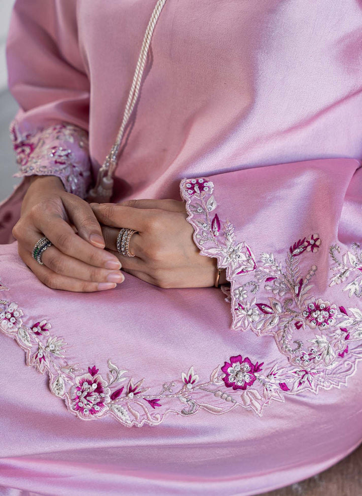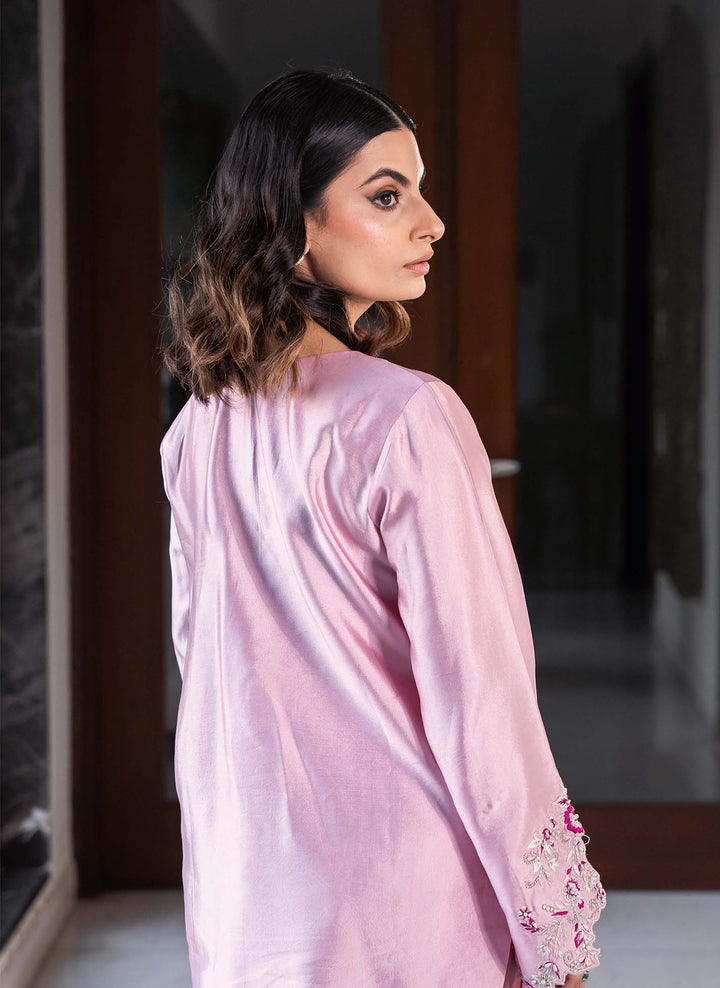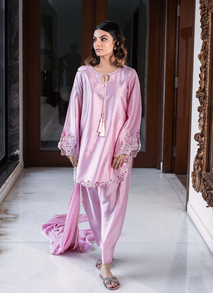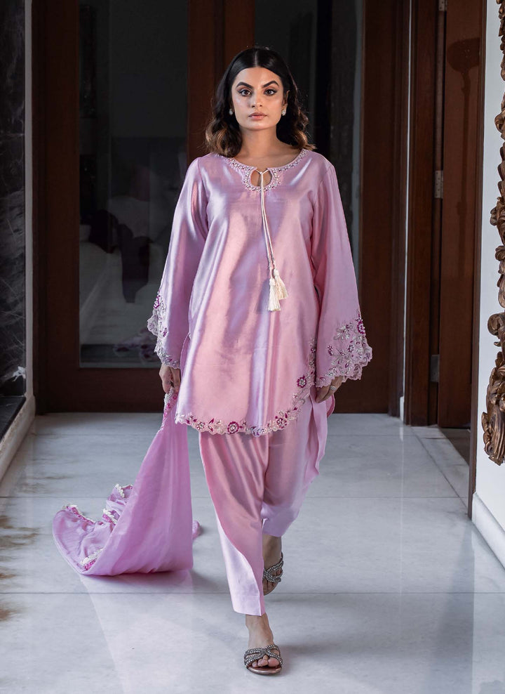 Candy Blush is a vibrant short shirt adorned with elegant contrasting embroideries, delicate hand embellishments, and playful tassels along the neckline. The fusion-cut sleeves feature intricate embroidery, adding a contemporary touch to this classic silhouette. Paired with a khari shalwar and a luxurious silk dupatta & lace insertions, this ensemble exudes effortless charm, making it a perfect choice for any occasion.
