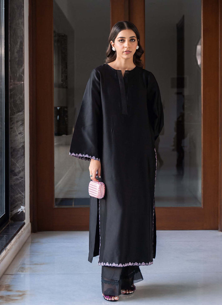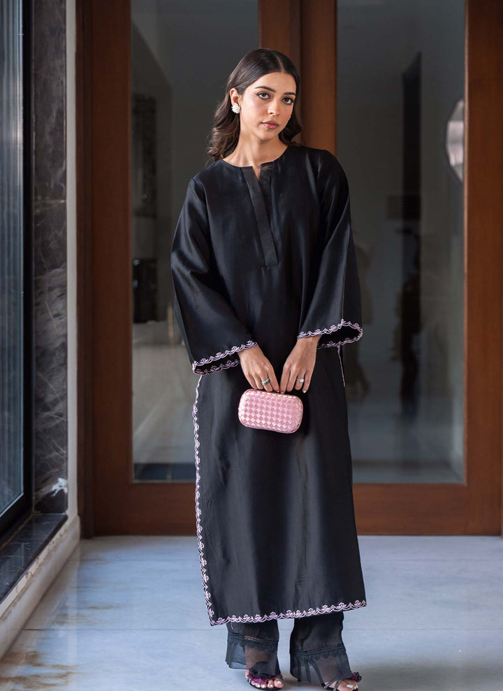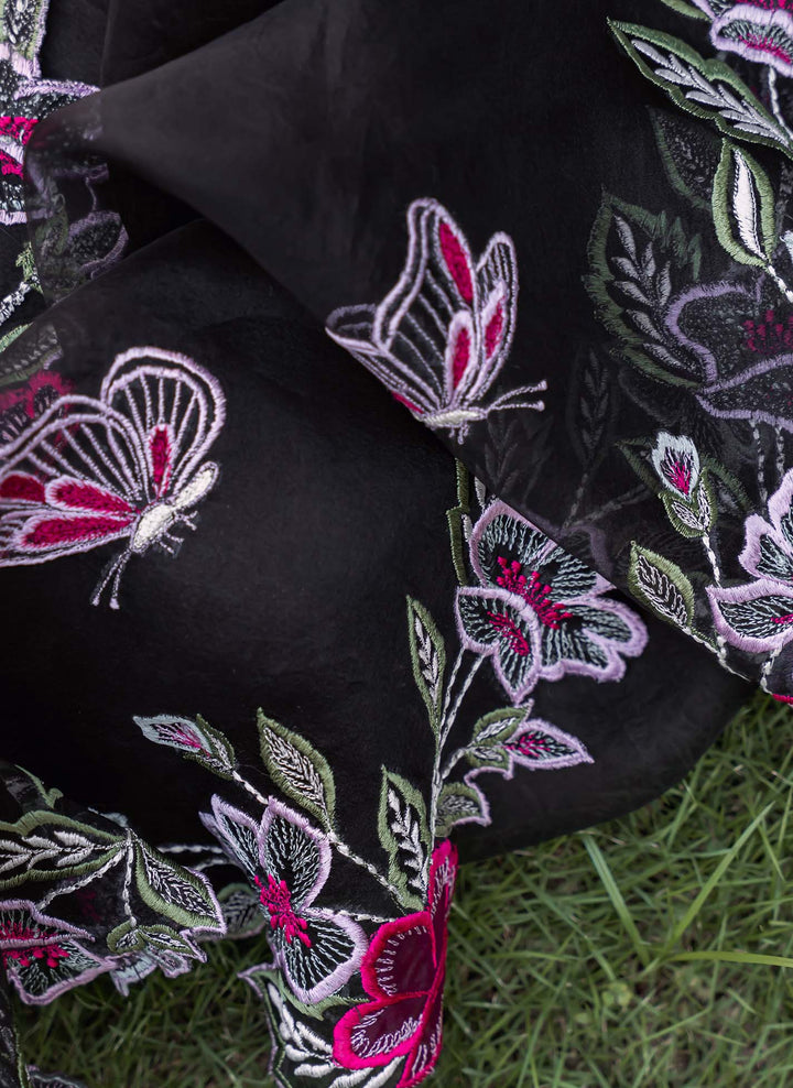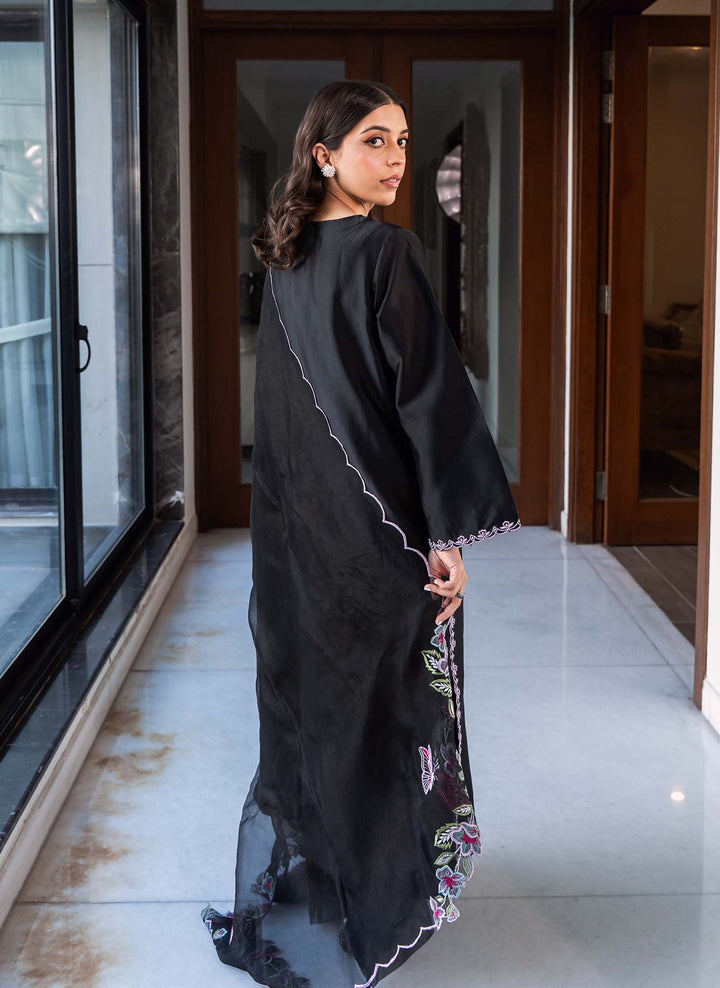 Floral Galaxy is a timeless black long shirt adorned with delicate embroidery along the sleeves and borders, featuring elegant organza detailing on the neckline. It is paired with black flared pants enhanced with lace and organza accents. The look is completed with a pure organza dupatta, beautifully finished with intricate multicolored embroideries and appliqué detailing on the corners, making it an absolute classic ensemble.